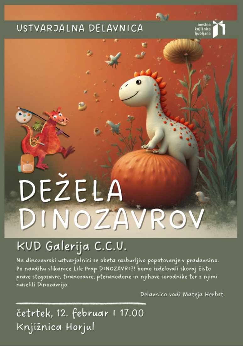 Vabimo vas na ustvarjalno delavnico DEŽELA DINOZAVROV , ki bo v četrtek, 12. FEBRUARJA, ob 17. uri v knjižnici Horjul.