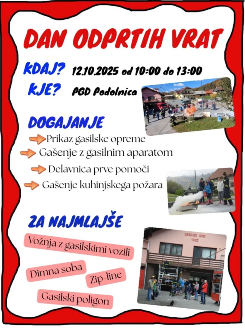 Gasilci PGD Podolnica v nedeljo, 12.10.2025 od 10h do 13h ure, organizirajo dan odprtih vrat. Na dnevu odprtih vrat, bodo za občane predstavili delo gasilcev, gasilska vozila in opremo.