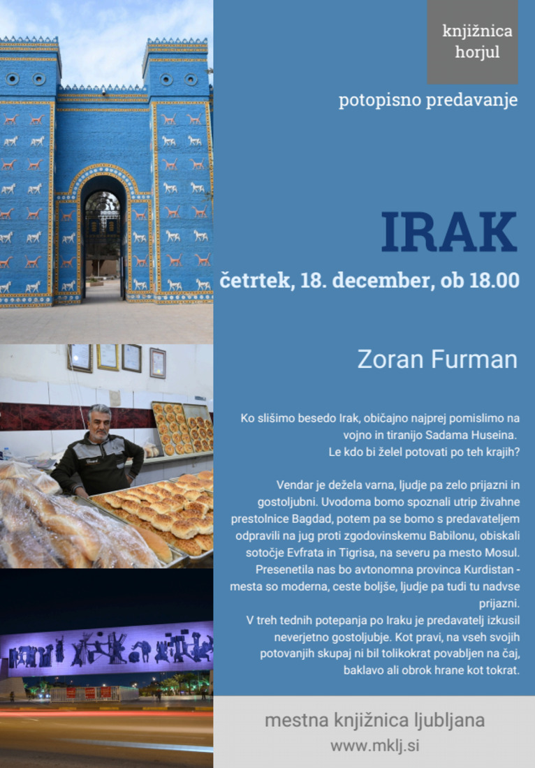 Vabimo vas na potopisno predavanje Irak, ki bo v četrtek, 18. decembra 2025, ob 18. uri, v Knjižnici Horjul.
