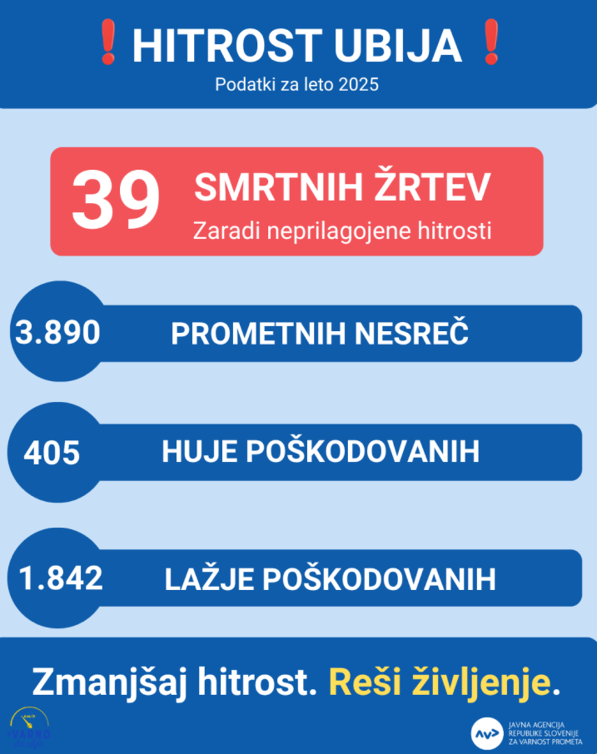 Neprilagojena hitrost ostaja glavni vzrok prometnih nesreč s smrtnim izidom. Lani je zaradi nje umrlo 39 ljudi. Ne hitite. Tistih nekaj sekund ne odtehta tveganja.